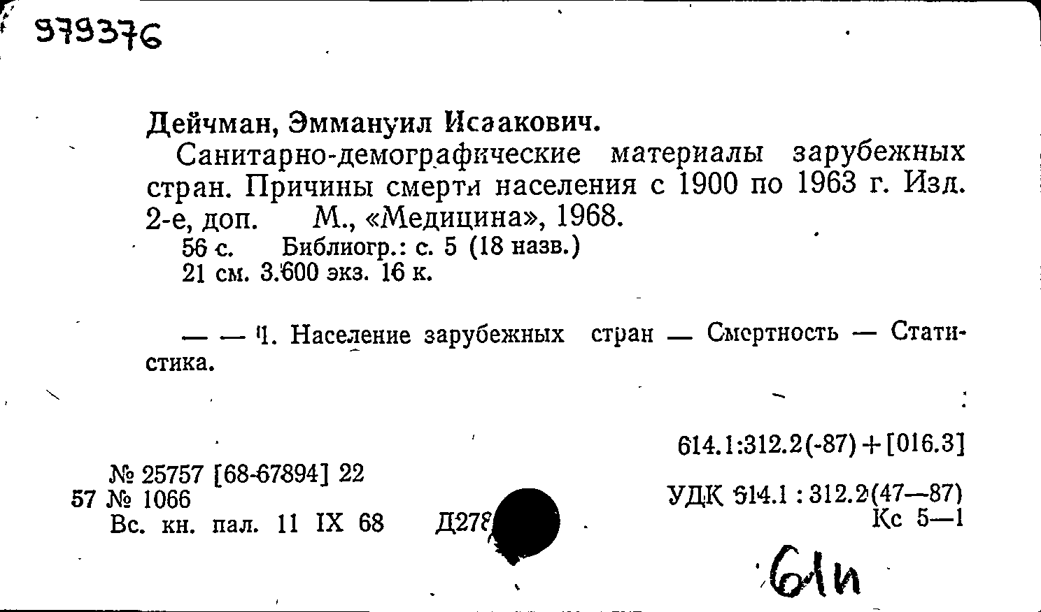 Дейчман Э. И. Санитарно-демографические материалы зарубежных стран. Причины смерти населения с 1900 по 1963 г. : сборник / Дейчман Э. И. — Издание второе, дополненное. — Москва : Медицина, 1968. — 54, [2] с. : таблицы. — Тираж 3600 экземпляров.