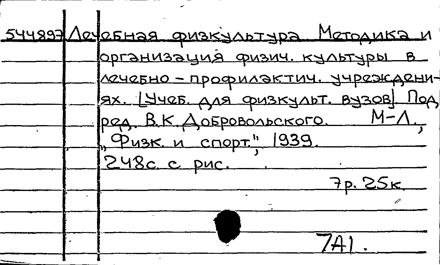 Лечебная физкультура: методика и организация физической культуры в лечебно-профилактических учреждениях : учебник для физкультурных вузов / Гандельсман А. Б., Добровольский В. К., Елкин М. В., Холодковская Е. И., Раздольский И. Я., Финкельштейн А. Н. ; под редакцией В. К. Добровольского, М. И. Куслик ; введение М. И. Куслик. — Ленинград : Физкультура и спорт, 1939. — 247, [1] с. : иллюстрации, таблицы. — Тираж 8000 экземпляров.