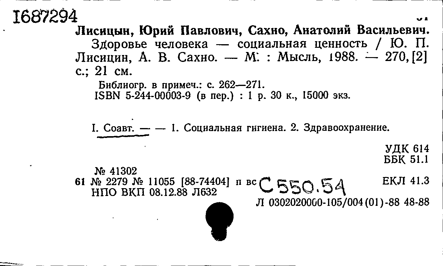Лисицын Ю. П. Здоровье человека - социальная ценность : монография / Лисицын Ю. П., Сахно А. В. — Москва : Мысль, 1988. — 270, [2] с. — Тираж 15000 экземпляров. — ISBN 5-244-00003-9.