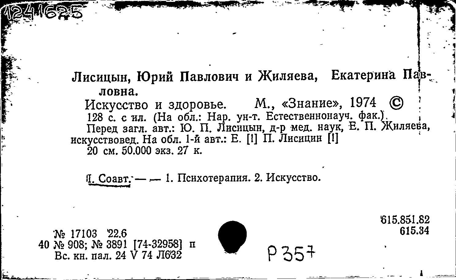 Лисицын Ю. П. Искусство и здоровье / Лисицын Ю. П., Жиляева Е. П. — Москва : Знание, 1974. — 127, [1] с. : иллюстрации. — (Народный университет. Естественно-научный факультет). — Тираж 50000 экземпляров.