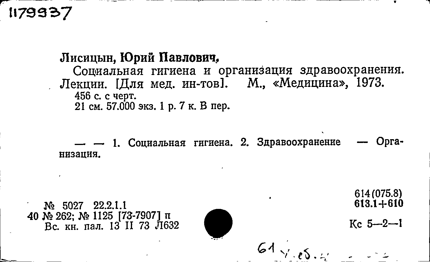 Лисицын Ю. П. Социальная гигиена и организация здравоохранения : лекции: учебное пособие для студентов медицинских институтов / Лисицын Ю. П. — Москва : Медицина, 1973. — 455, [1] с. : таблицы, графики, диаграммы. — Тираж 57000 экземпляров.