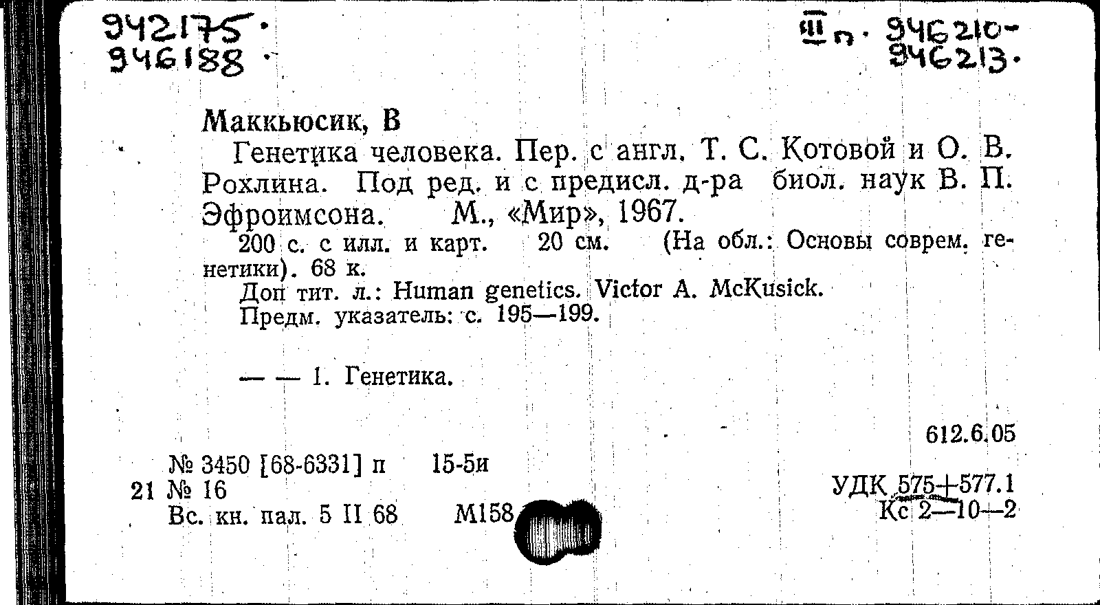 Маккьюсик В. Генетика человека : монография / Маккьюсик В. ; под редакцией и с предисловием В. П. Эфроимсона ; перевод с английского Т. С. Котовой, О. В. Рохлина. — Москва : Мир, 1967. — 199, [1] с. : иллюстрации, таблицы, графики. — (Основы современной генетики).