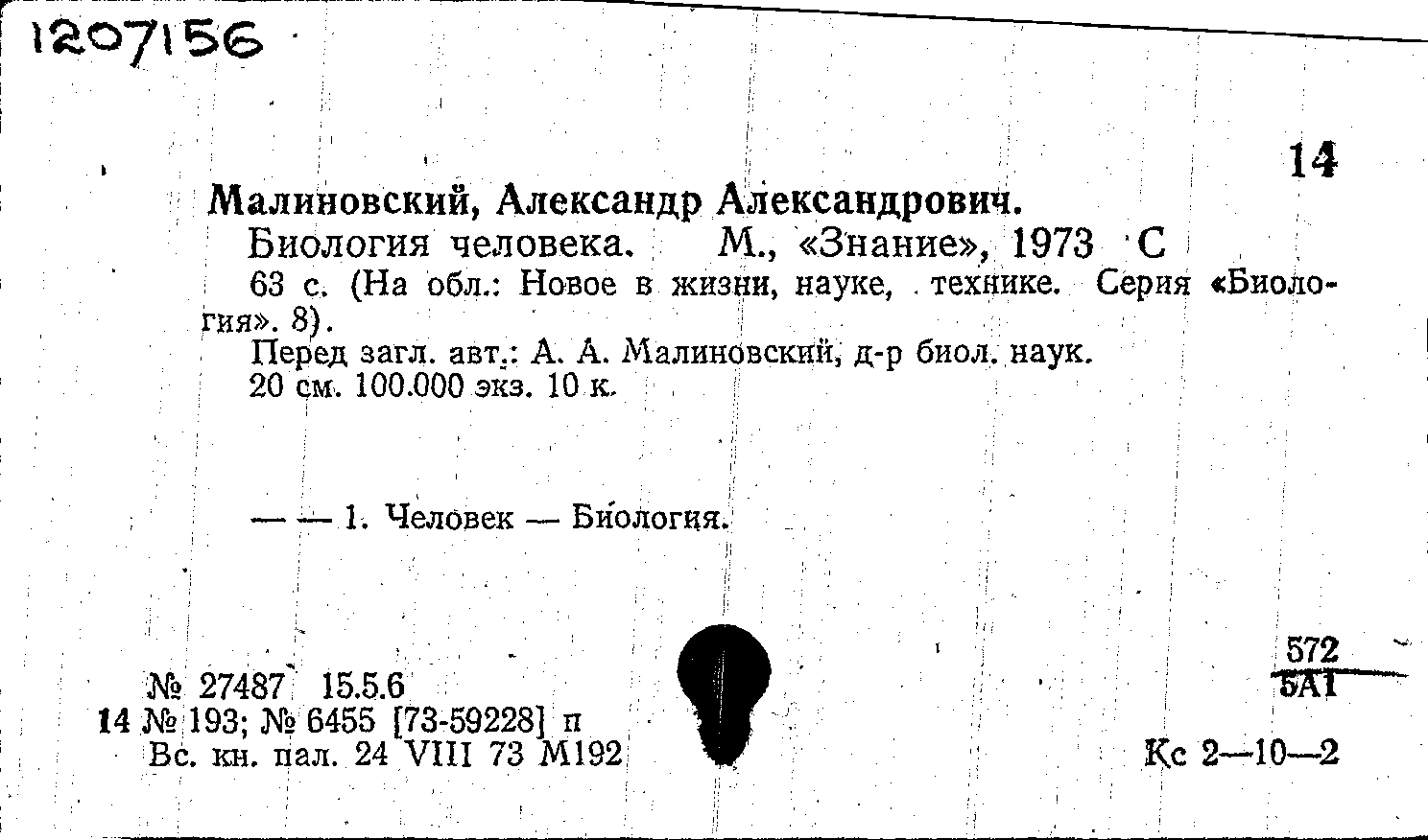 Малиновский А. А. Биология человека / Малиновский А. А. — Москва : Знание, 1973. — 61, [2] с. : иллюстрации, таблица. — (Новое в жизни, науке, технике. Серия "Биология"; 8/1973). — Тираж 10000 экземпляров.
