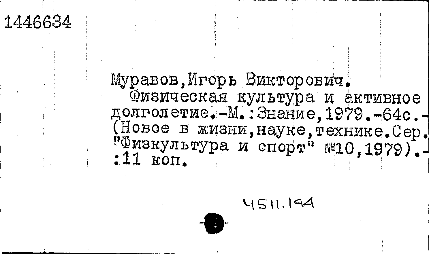 Муравов И. В. Физическая культура и активное долголетие / Муравов И. В. — Москва : Знание, 1979. — 64 с. : иллюстрации, таблицы. — (Новое в жизни, науке, технике. Серия "Физкультура и спорт"; 10/1979). — Тираж 43650 экземпляров.