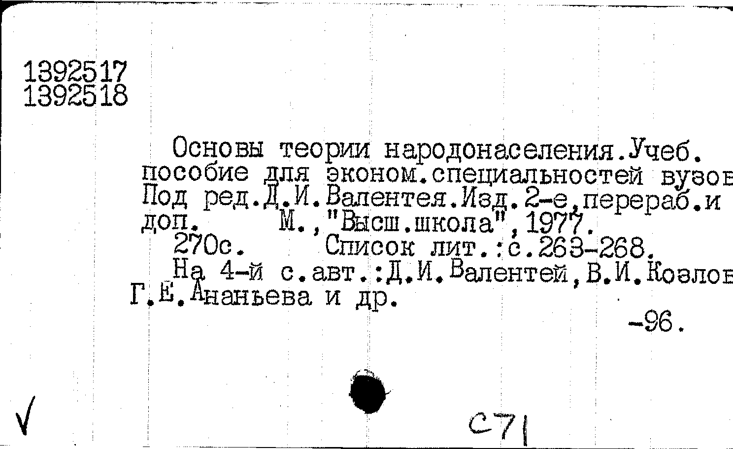 Основы теории народонаселения : учебное пособие для студентов экономических специальностей вузов / Валентей Д. И., Козлов В. И., Ананьева Г. Е., Шелестова Д. К., Судоплатов А. П., Панкратьева Н. В., Бжилянский Ю. А., Киселева Г. П., Рыбаковский Л. Л., Хорев Б. С., Кваша А. Я., Ковальская Н. Я., Ворожейкин Е. М., Сысенко В. А., Медкова В. М. ; под редакцией Д. И. Валентея ; подготовка материалов к печати Л. Н. Казаковой ; библиография составлена А. Г. Давыдовой. — Издание 2-е, переработанное и дополненное. — Москва : Высшая школа, 1977. — 267, [2] с. : таблицы, схемы. — Тираж 12000 экземпляров.