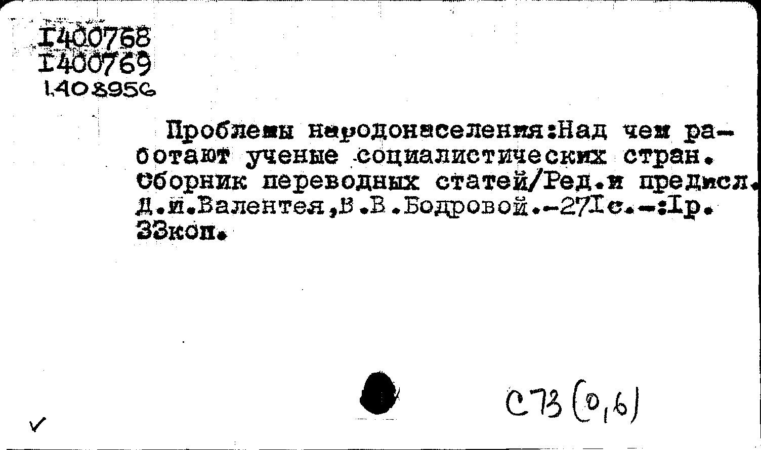 Проблемы народонаселения. Над чем работают ученые социалистических стран : сборник переводных статей / редакция и предисловие Д. И. Валентея, В. В. Бодровой ; составитель В. В. Бодрова ; переводчики: Т. А. Вайс, А. А. Гербова, И. И. Земельман, Л. Н. Клепацкий, А. Н. Никитина, А. С. Первушин, Н. Ф. Савченкова, О. Д. Сафонова, Т. И. Сокол, А. Н. Саморукова, В. П. Шрам. — Москва : Прогресс, 1977. — 269, [2] с. : таблицы. — Тираж 6500 экземпляров.