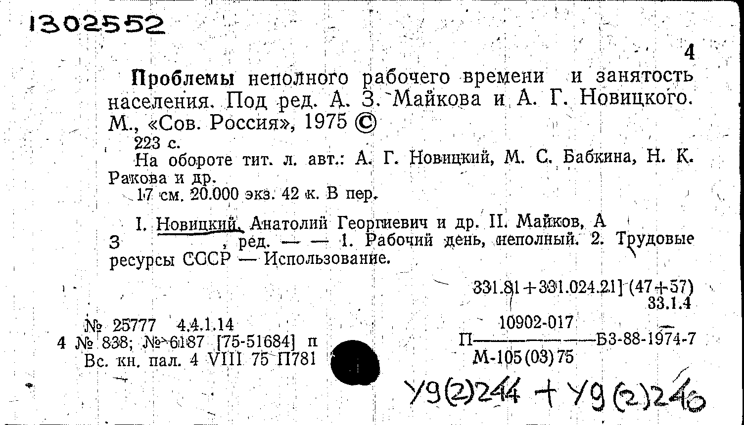 Проблемы неполного рабочего времени и занятость населения / Новицкий А. Г., Бабкина М. С., Ракова Н. К., Золотарева С. А., Дорохова Л. С., Миль Г. В., Майков А. З., Парфенов Е. А. ; под редакцией А. З. Майкова, А. Г. Новицкого. — Москва : Советская Россия, 1975. — 221, [2] с. : таблицы. — Тираж 20000 экземпляров.
