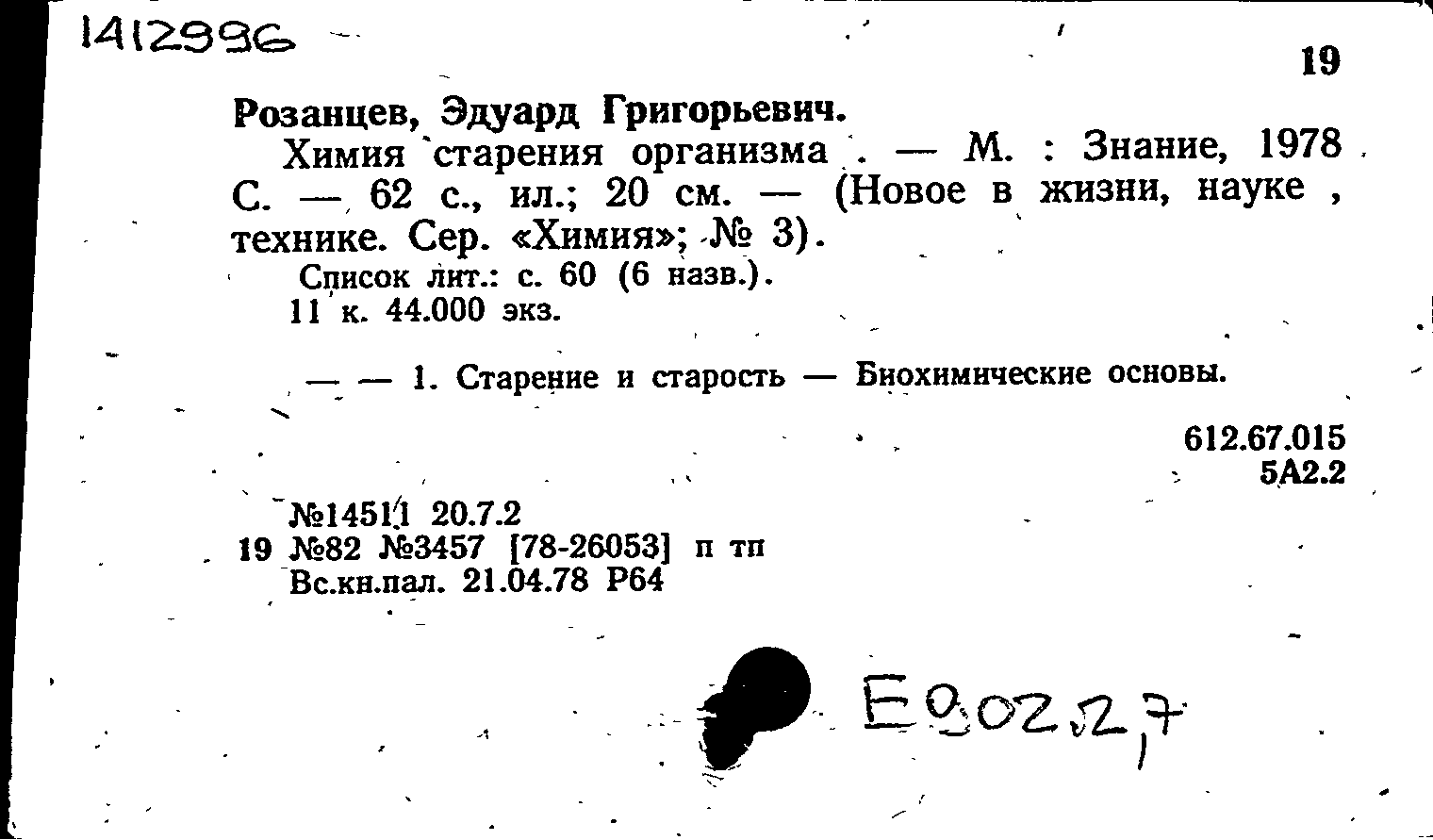 Розанцев Э. Г. Химия старения организма / Розанцев Э. Г. — Москва : Знание, 1978. — 59, [3] с. : иллюстрации. — (Новое в жизни, науке, технике. Серия "Химия"; 3/1978). — Тираж 44000 экземпляров.