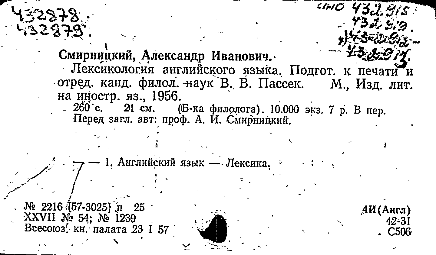 Смирницкий А. И. Лексикология английского языка / Смирницкий А. И., Пассек В. В. ; подготовил к печати и отредактировал В. В. Пассек. — Москва : Издательство литературы на иностранных языках, 1956. — 259, [1] с. — (Библиотека филолога). — Тираж 10000 экземпляров.