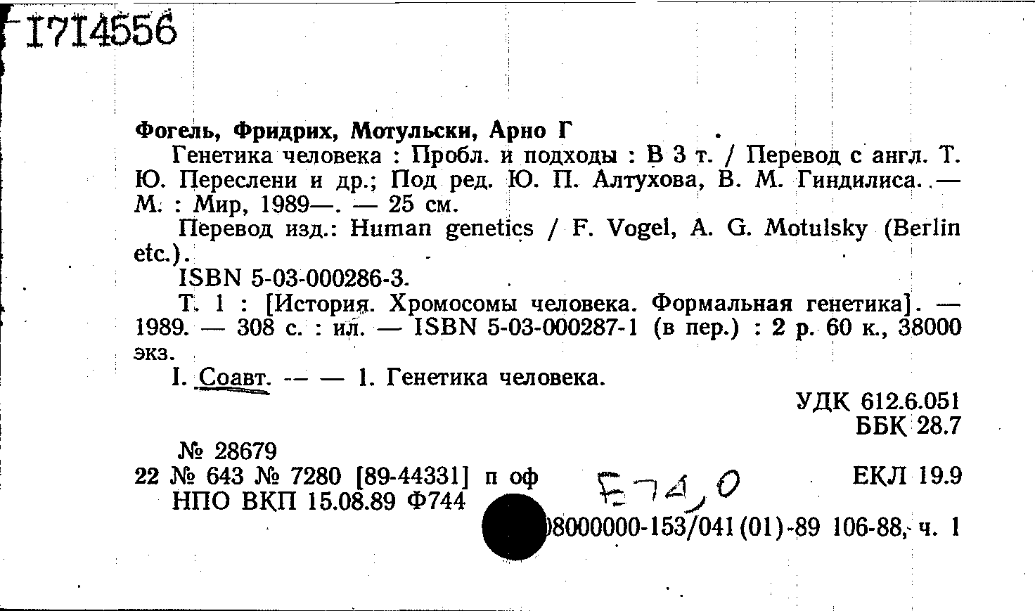 Фогель Ф. Генетика человека: проблемы и подходы : в трех томах. Том 1. История. Хромосомы человека. Формальная генетика / Фогель Ф., Мотульски А. ; редакция и предисловие Ю. П. Алтухова, В. М. Гиндилиса ; перевод с английского Т. Ю. Переслени, С. В. Агеева, К. Н. Гринберга. — Москва : Мир, 1989. — 308 с. : иллюстрации, таблицы, схемы. — Тираж 38000 экземпляров. — ISBN 5-03-000287-1. — 5-03-000286-3.