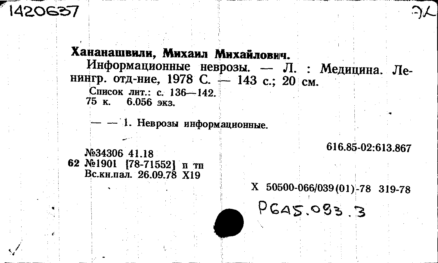 Хананашвили М. М. Информационные неврозы : монография / Хананашвили М. М. — Ленинград : Медицина. Ленинградское отделение, 1978. — 143 с. — Тираж 6056 экземпляров.