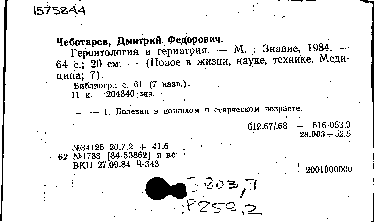 Чеботарев Д. Ф. Геронтология и гериатрия / Чеботарев Д. Ф. — Москва : Знание, 1984. — 62, [2] с. — (Новое в жизни, науке, технике. Серия "Медицина"; 7/1984). — Тираж 20484 экземпляров.