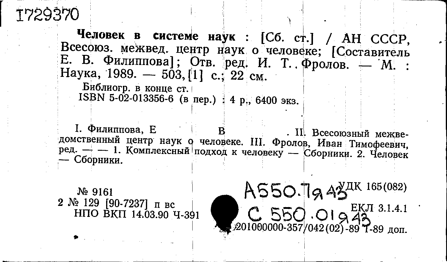 Человек в системе наук : сборник статей / ответственный редактор И. Т. Фролов ; составитель Е. В. Филиппова ; Академия наук СССР, Всесоюзный межведомственный центр наук о человеке. — Москва : Наука, 1989. — 503, [1] с. : таблицы, графики. — Тираж 6400 экземпляров. — ISBN 5-02-013356-6.