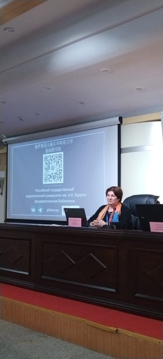 "Российский государственный педагогический университет им. А.И. Герцена. Фундаментальная библиотека как ресурсный и сервисный центр в экосистеме университета" (俄罗斯国立赫尔岑师范大学基础图书馆:大学生态系统中的核心资源与服务中心), в котором рассказала об университете как лидере в обучении иностранных студентов в России, о ресурсном и технологическом развитии фундаментальной библиотеки, о тесной интеграции контента и сервисов библиотеки с электронной информационно-образовательной средой вуза.
