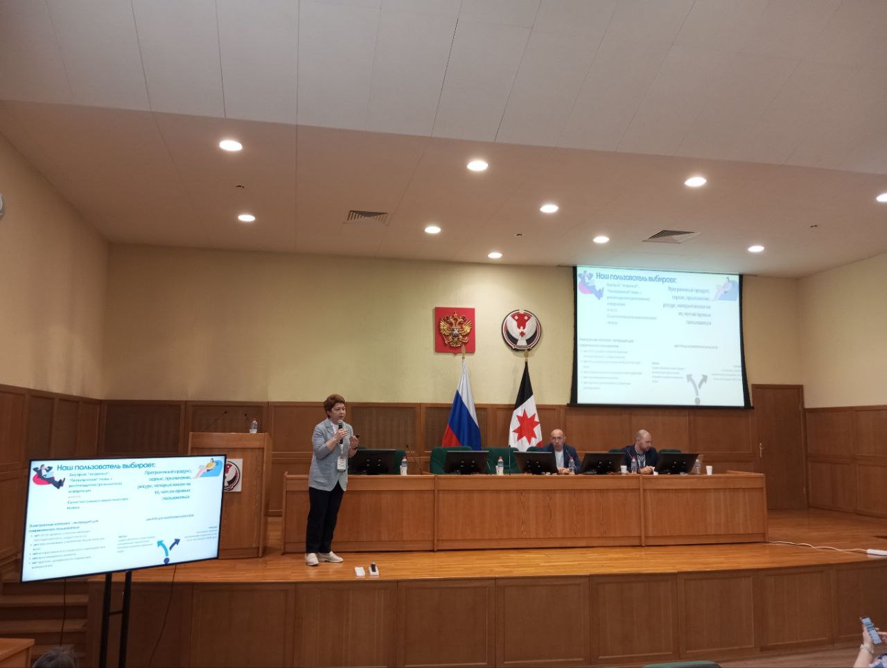 В этот же день ранее заместитель директора фундаментальной библиотеки выступила в Конференц-зале Дома Правительства Удмуртской республики на треке "Цифровая перезагрузка: новая реальность библиотечной практики" с докладом "Контент и сервисы университетской библиотеки: интеграция и взаимодействие с экосистемой вуза".
