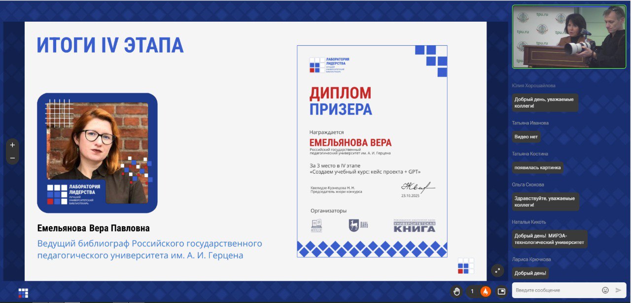 Вера Емельянова стала лауреатом Всероссийского конкурса «Лаборатория лидерства − 2025: лучший университетский библиотекарь», а также бронзовым призером в IV этапе «Создаем учебный курс: кейс проекта + GPT».
