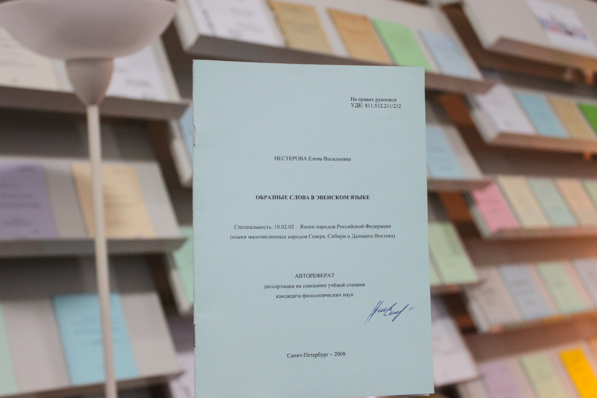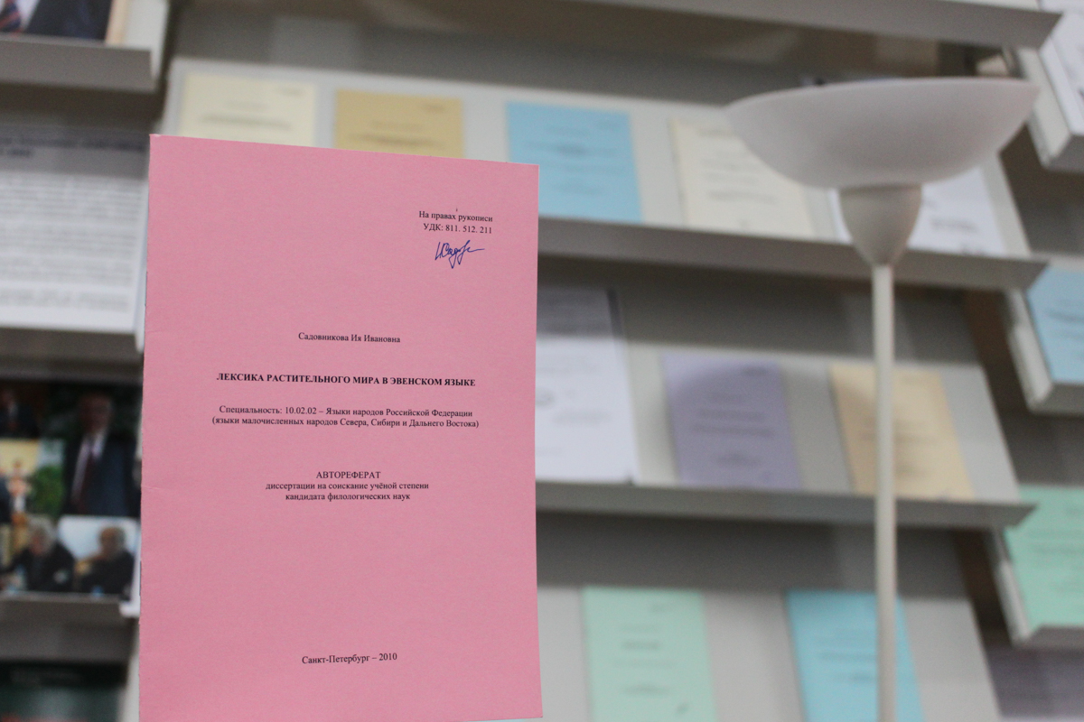 Выставка знакомит с авторефератами этих диссертаций, защищенных с середины XX века по настоящее время. Здесь можно узнать о хантыйском, мансийском, корякском, нивхском, юкагирском, нанайском, ненецком, саамском, тувинском, эскимосском, эвенском и эвенкийском языках, произведениях декоративно-прикладного искусства коми, чукчей, якутов, религиозных воззрениях саамов, селькупов, тунгусов, хантов и манси, семейном укладе эвенов, песенных традициях чукчей, традиционных играх удэгейцев, самоидентичности северных карел, восточных хантов, коми и населения Кольского Заполярья.
